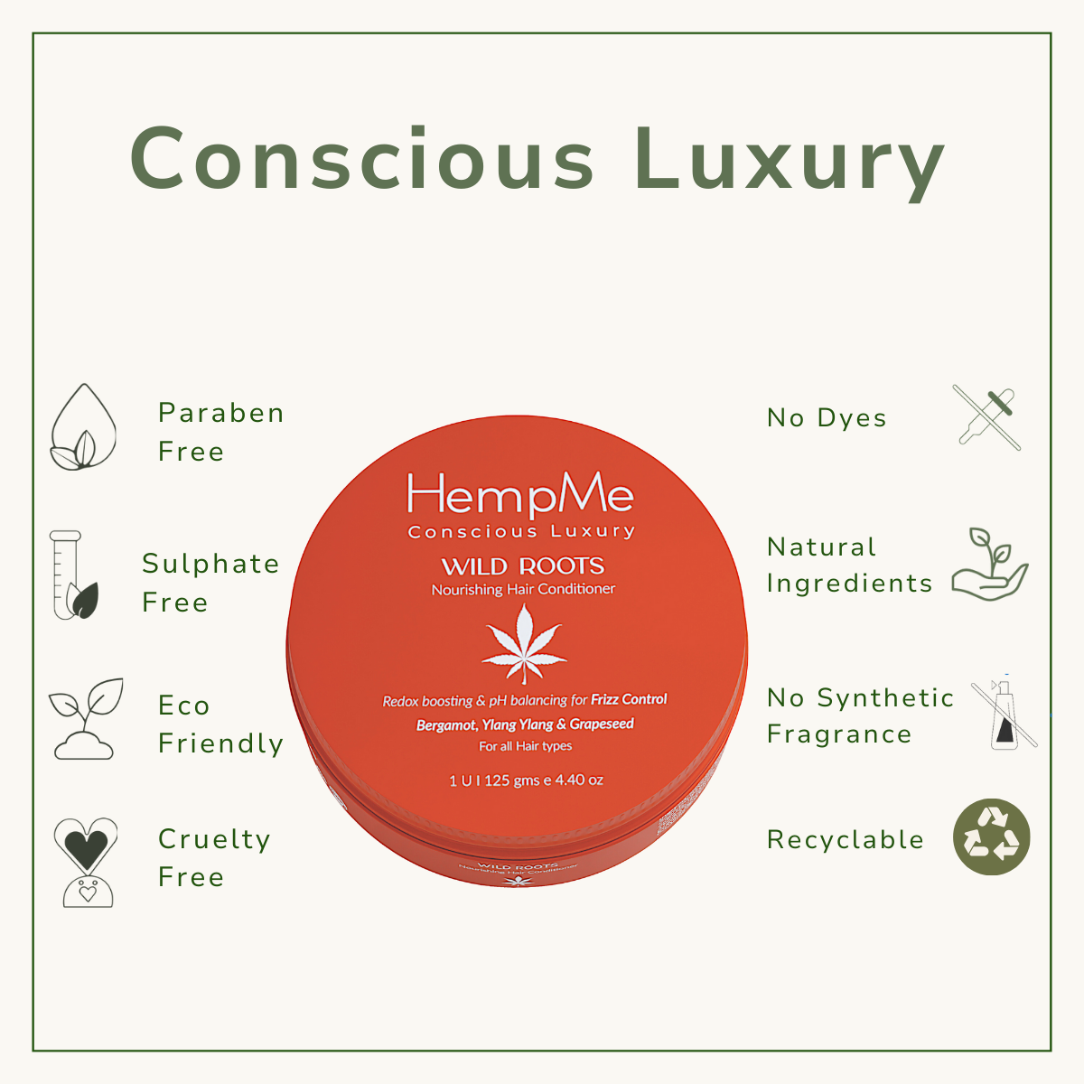 "Wild Roots" Conditioner harmonizes hair's natural beauty while combating frizz and split ends. Designed for all hair types, especially those prone to dryness and breakage, it is meticulously formulated with amino acids and biotin to strengthen hair bonds and reduce split ends. Our unique redox-boosting and pH-balancing formula delivers vital vitamins and proteins to fortify and deeply moisturize each strand. Infused with hemp oil, Phyto-concentrates, essential oils, and 98% natural ingredients, it pampers your hair, providing lush, frizz-free locks.