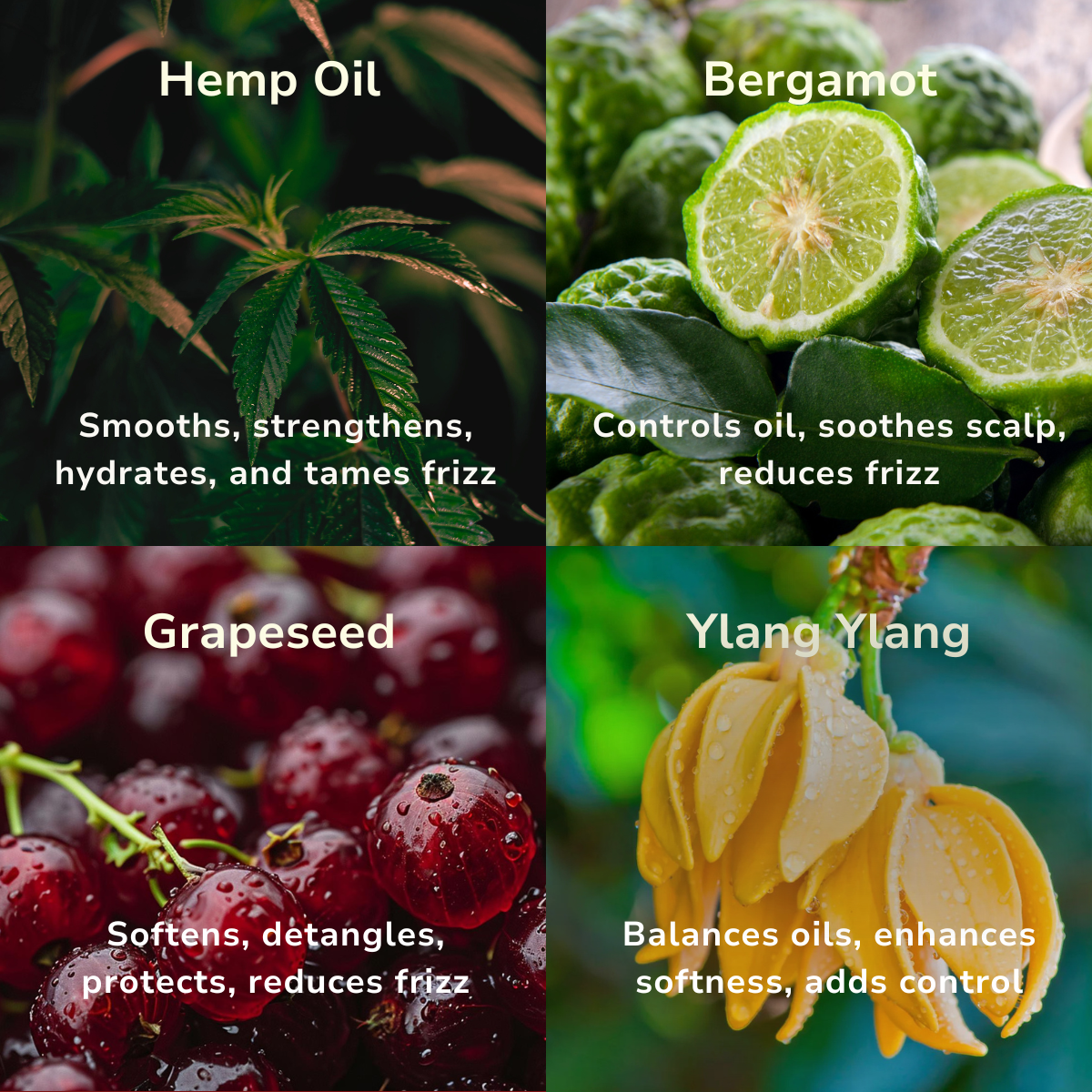 A luxurious nourishing conditioner with 98% natural ingredients, including Hemp oil, amino acids, biotin, proteins, and vitamins, to deeply nourish, moisturize, prevent split ends, and tame frizz.